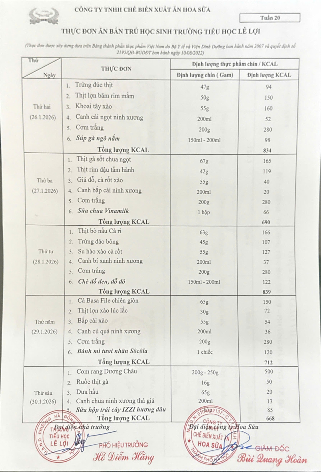 THỰC ĐƠN BÁN TRÚ TUẦN 20