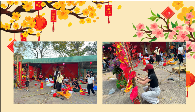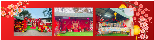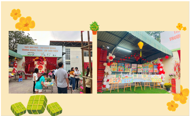 Cành đào, nhành mai, câu đối, bao lì xì… tất cả hòa quyện tạo nên một không gian Tết ấm áp và đầy sắc màu. Các con học sinh háo hức ngắm nhìn “thành quả” của khối mình, ánh mắt rạng rỡ và tràn đầy mong chờ.