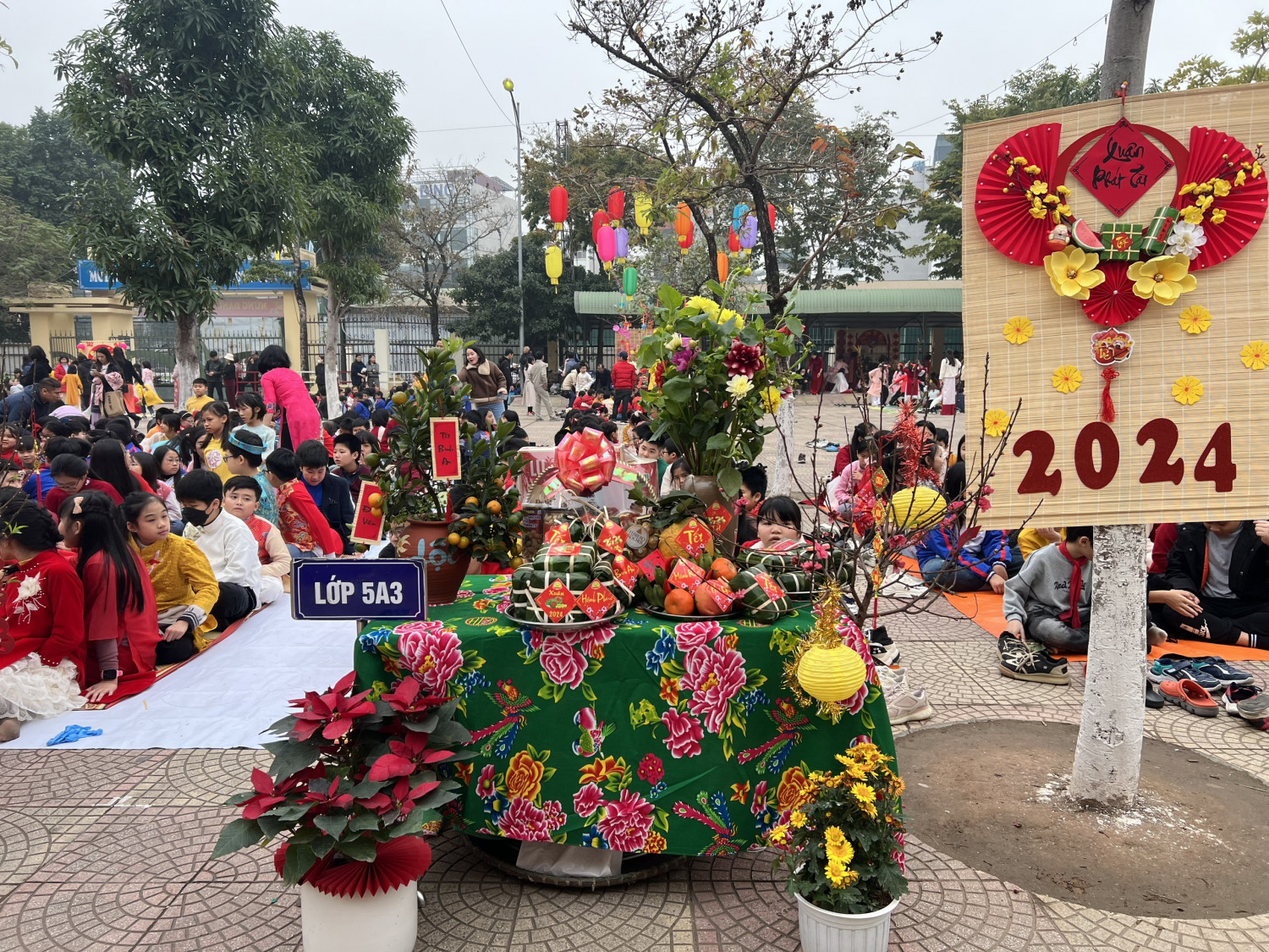 08h00! Sân trường là bức tranh mùa Xuân với nhiều gam màu sinh động. Cô giáo, phụ huynh và học sinh điệu đà và đẹp hơn trong trang phục ngày Tết cổ truyền. Mỗi lớp có cách bày trí khác nhau nhưng ở đó đều hội tụ những tình cảm, sự tâm huyết của phụ huynh gửi tặng các thầy cô và con của mình.