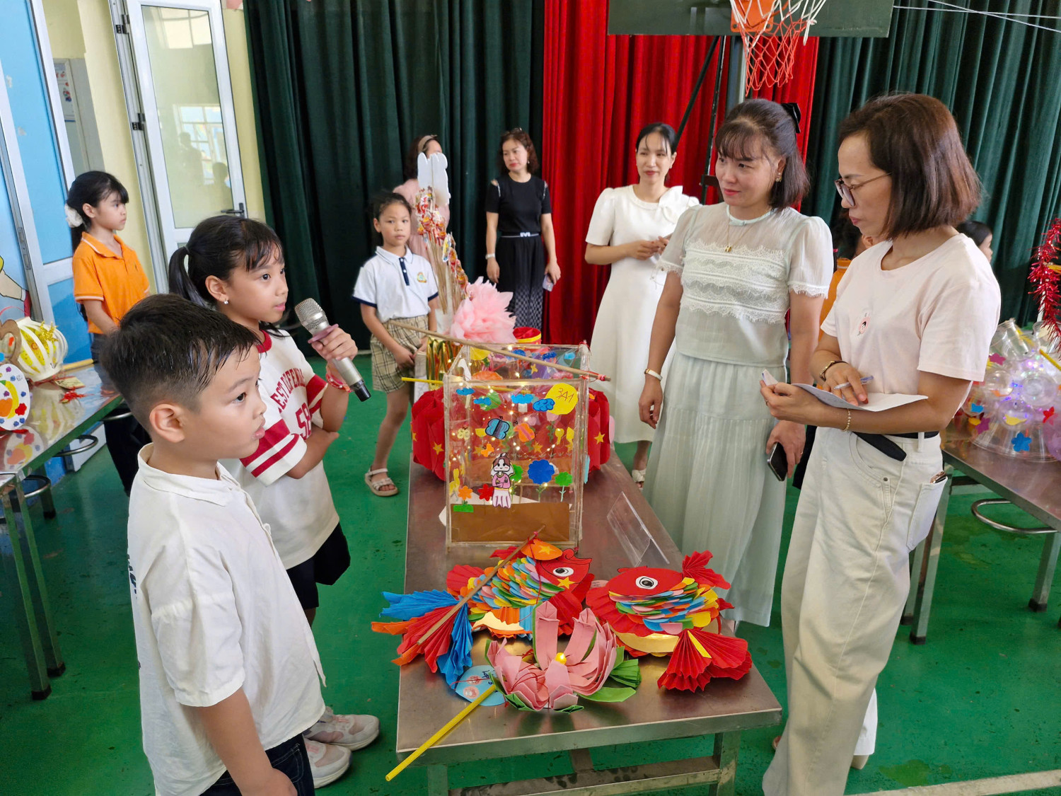 Sau khi hoàn thành sản phẩm, các em học sinh còn tự tin thuyết trình trước thầy cô và bạn bè về chiếc đèn trung thu hay mặt nạ mà mình vừa tạo nên. Các em giới thiệu ý tưởng, vật liệu, cách làm cũng như gửi gắm thông điệp và ước mơ của mình qua từng sản phẩm. Đây là cơ hội tuyệt vời để rèn luyện kỹ năng thuyết trình, giao tiếp và tự tin trước đám đông, đồng thời khuyến khích tinh thần sáng tạo, hợp tác nhóm.
