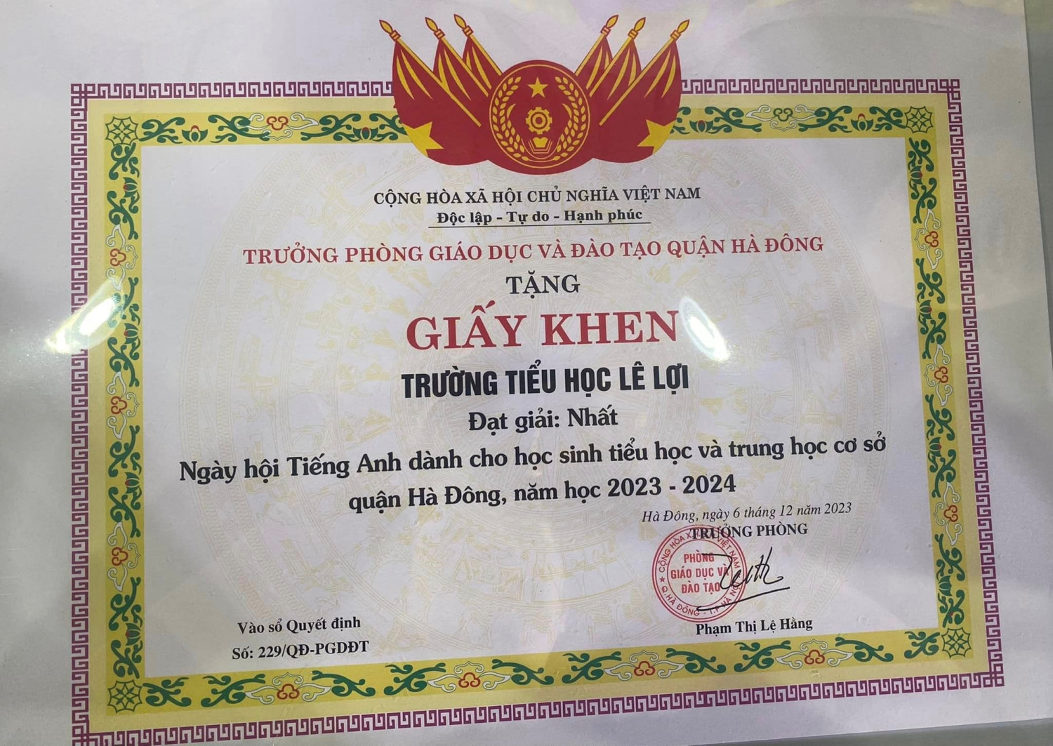 Chiều ngày 05/12/2023, học sinh trường Tiểu học Lê Lợi đã tham gia Ngày hội Tiếng Anh (English Festival) dành cho học sinh cấp Tiểu học và THCS quận Hà Đông năm học 2023 - 2024 do Phòng Giáo dục và Đào tạo quận Hà Đông tổ chức.