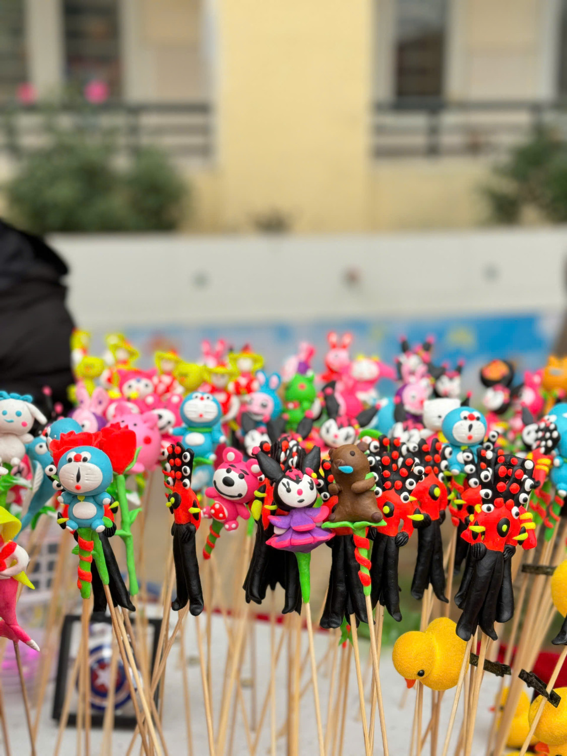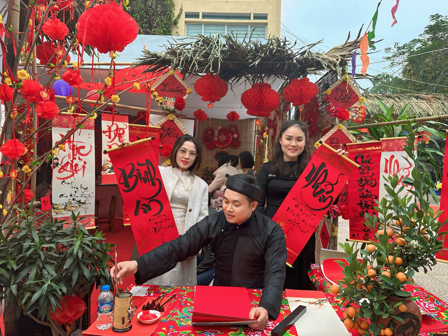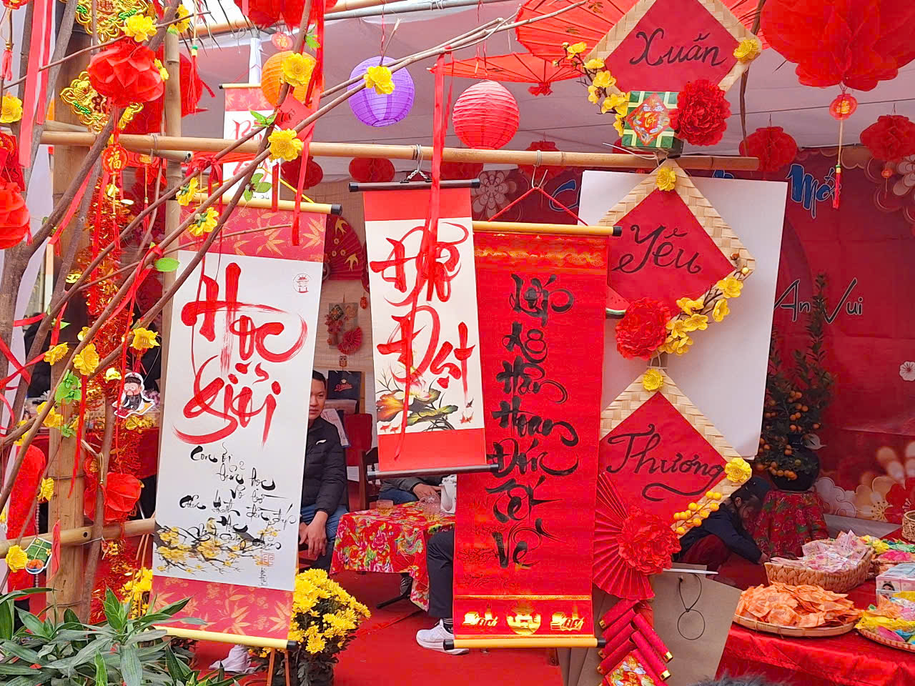 Bên cạnh đó, hội chợ còn có những gian hàng truyền thống đậm đà bản sắc dân tộc. Các em được trải nghiệm nặn tò he, viết chữ thư pháp – những nét văn hóa xưa gắn liền với Tết cổ truyền của người Việt.