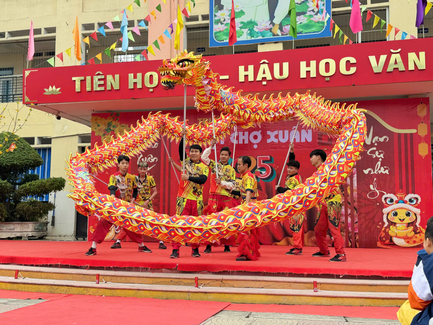 Mở màn hội chợ là những tiết mục văn nghệ đặc sắc do chính các em học sinh thể hiện, đem đến không khí rộn ràng và vui tươi. Đặc biệt, màn múa lân rồng sôi động đã khiến cả sân trường trở nên náo nhiệt, mang đến niềm vui và những lời chúc tốt đẹp cho năm mới.
