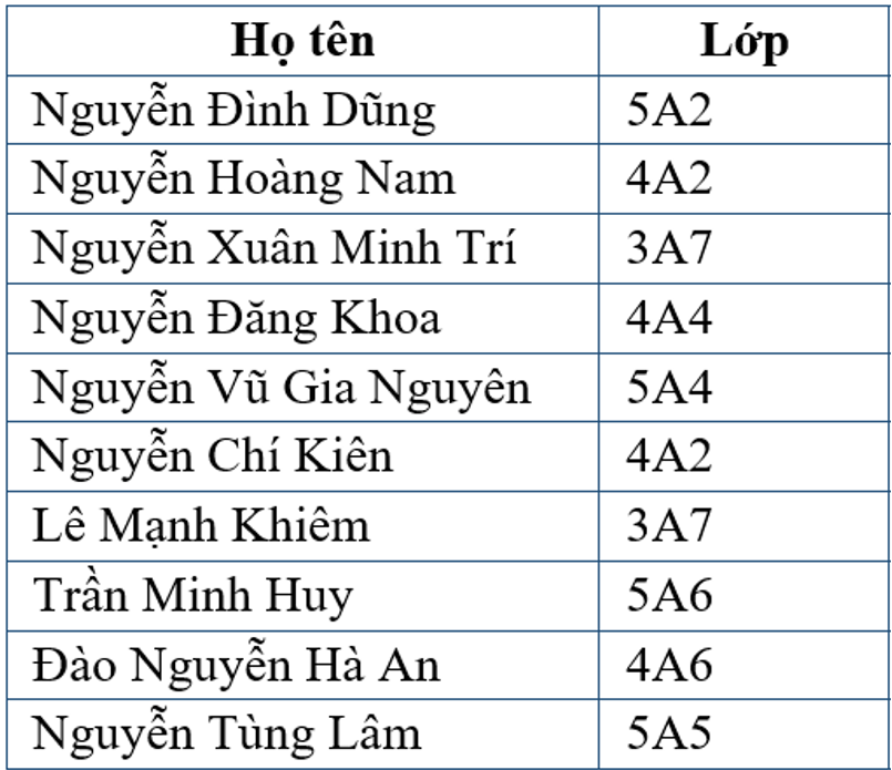 Tại Vòng loại vừa qua, những em dẫn đầu về điểm số cũng như thời gian làm bài đã thể hiện năng lực rất đáng được khích lệ. Căn cứ vào điểm số và thời gian làm bài của các thí sinh, Ban Tổ chức lựa chọn top 04 thí sinh xuất sắc nhất với điểm số đạt từ 700 điểm trở lên vào Vòng sơ khảo. Nhà trường chúc mừng và tuyên dương Top 10 học sinh xuất sắc Vòng loại của cuộc thi và đạt giải cấp trường, cụ thể như sau: