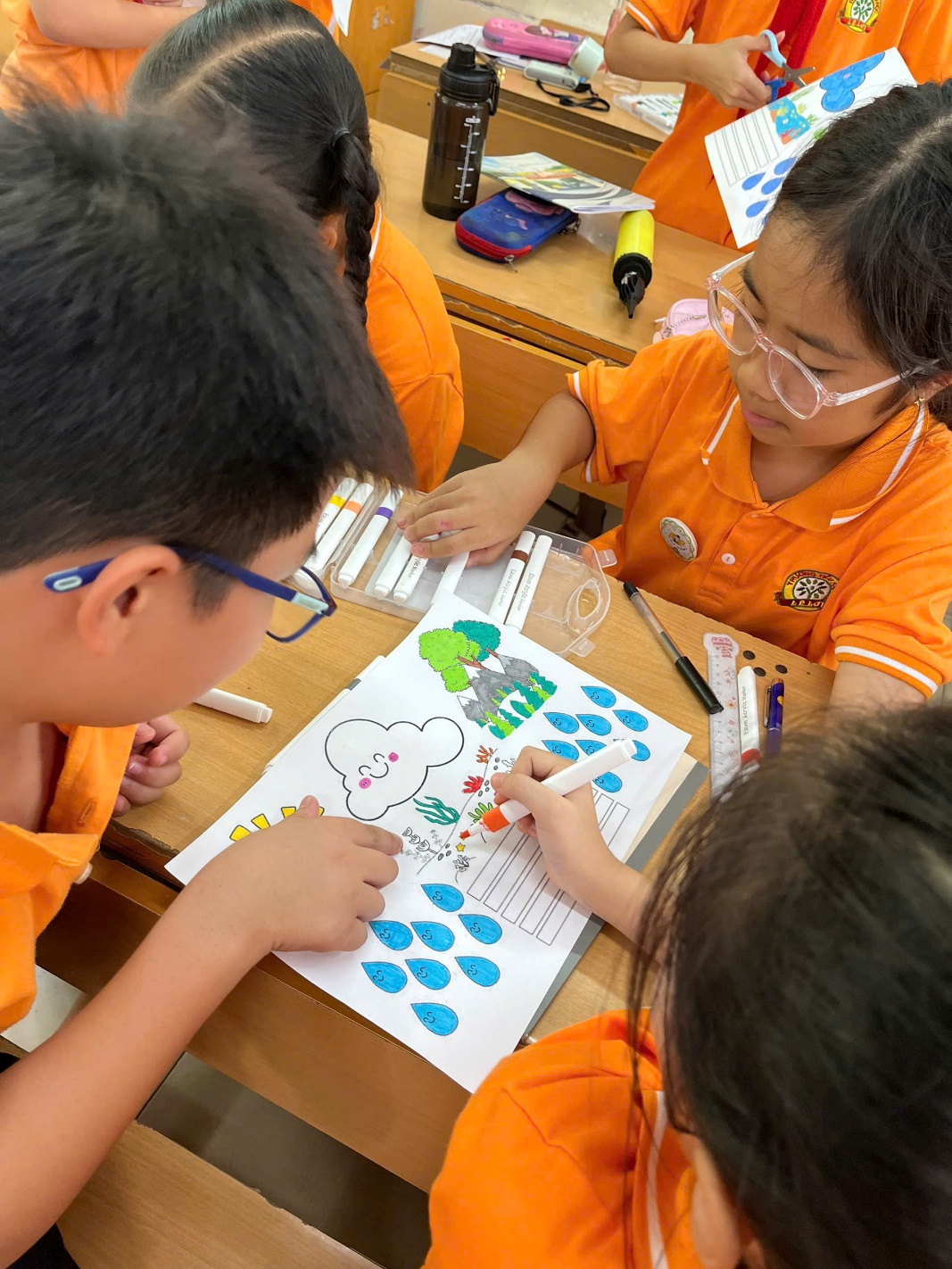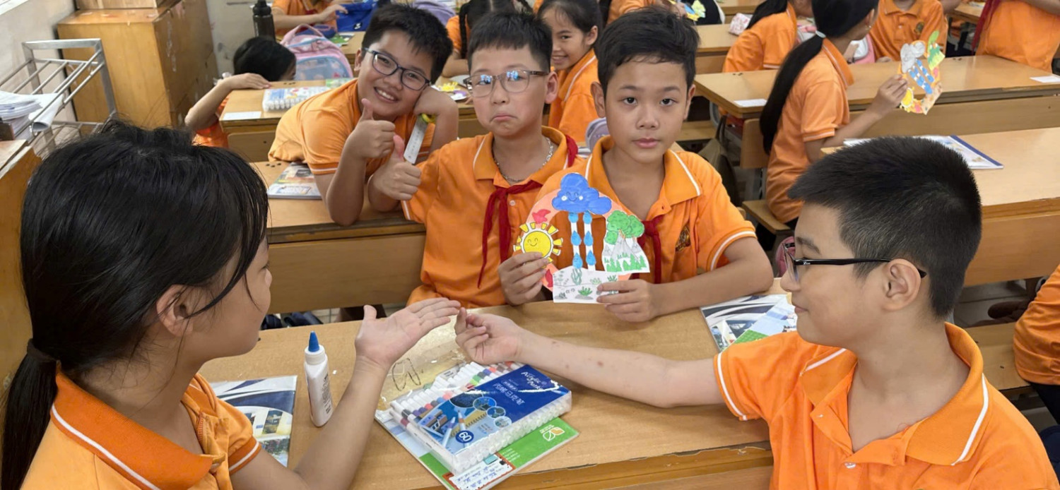 Không chỉ dừng lại ở sách vở, các em còn được quan sát mô hình, thực hiện thí nghiệm và thảo luận nhóm. Khi làn hơi nước bốc lên từ chiếc cốc thủy tinh, khi giọt nước đọng lại trên nắp hộp và rơi xuống – tiếng “ồ” vang lên thích thú, những ánh mắt sáng rực tò mò. Qua hoạt động trải nghiệm, các em được rèn luyện tư duy quan sát, khả năng hợp tác, và đặc biệt là ý thức bảo vệ nguồn nước – tài nguyên quý giá của sự sống.
