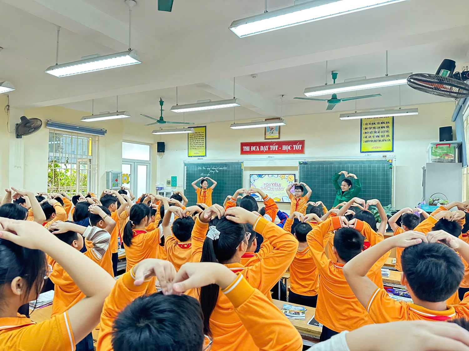Mở đầu tiết học, học sinh đã hòa mình vào hoạt động múa và hát bài “Tôi yêu sách hay”. Tiết mục vừa mang tính giải trí, vừa tạo tâm thế thoải mái, hứng khởi cho các em trước khi bước vào bài học. Giai điệu vui nhộn cùng những động tác đơn giản giúp lớp học trở nên gần gũi, thân thiện và tạo cảm xúc tích cực thúc đẩy tinh thần học tập.