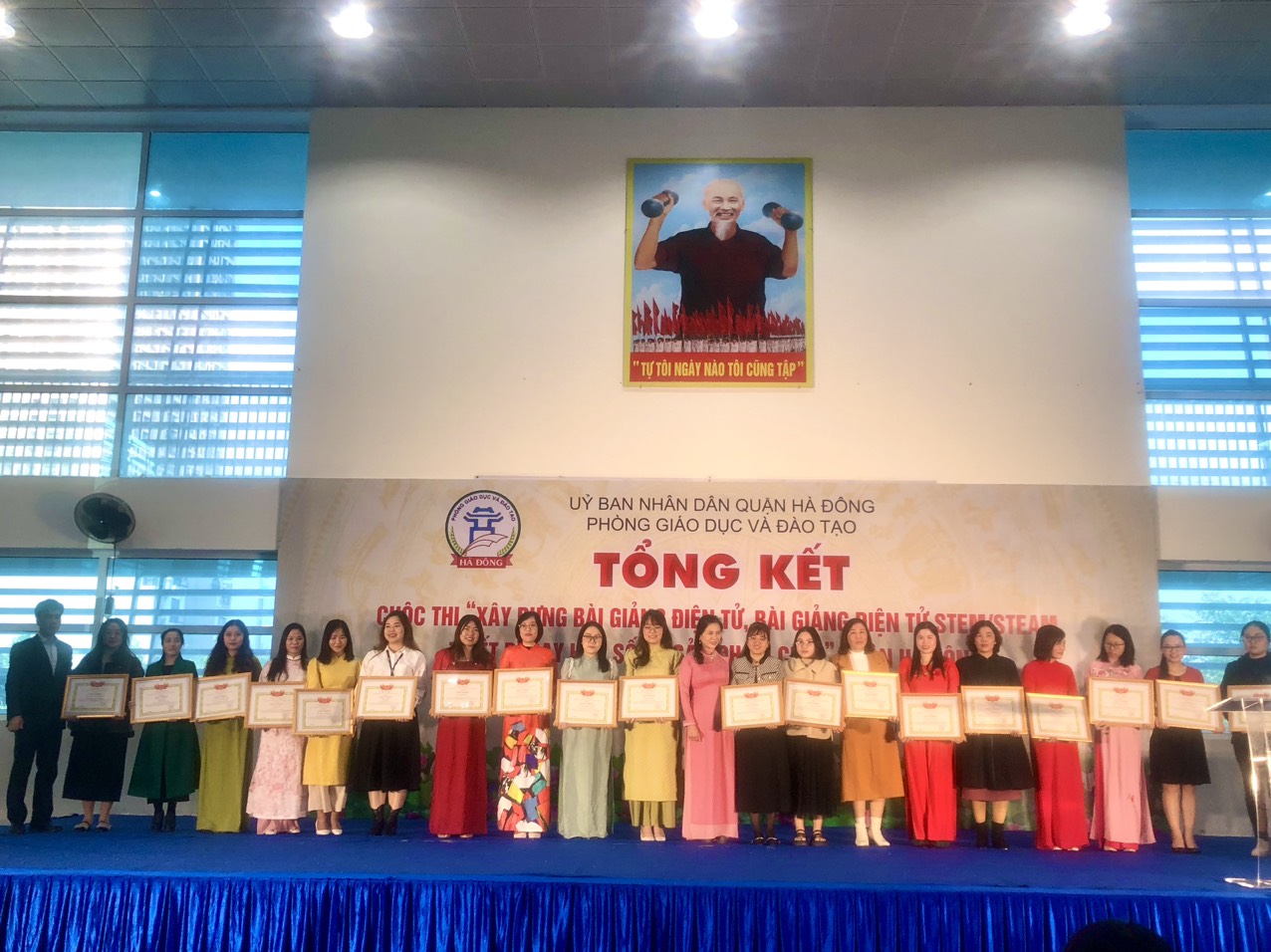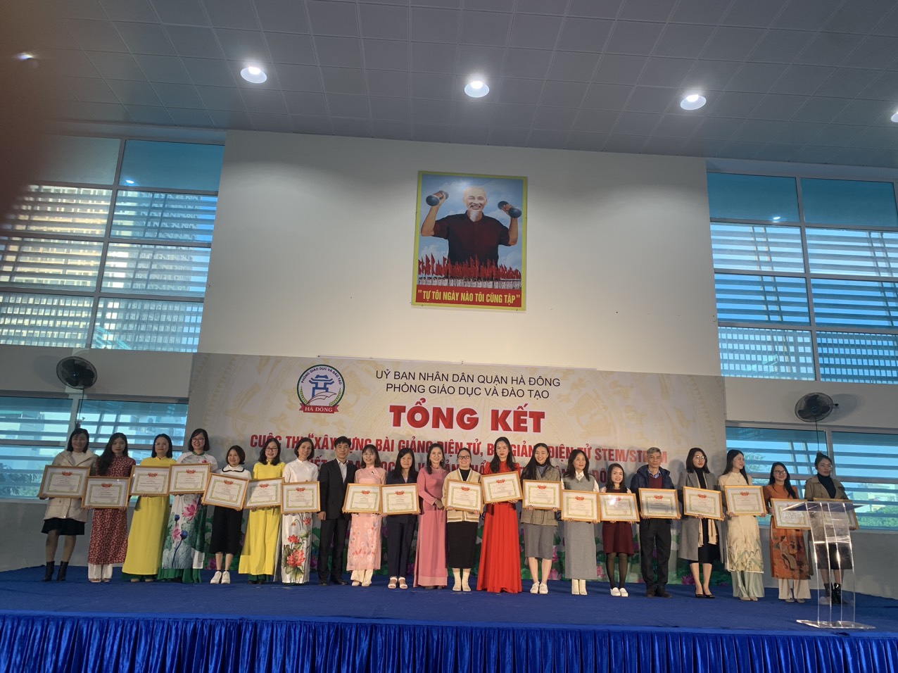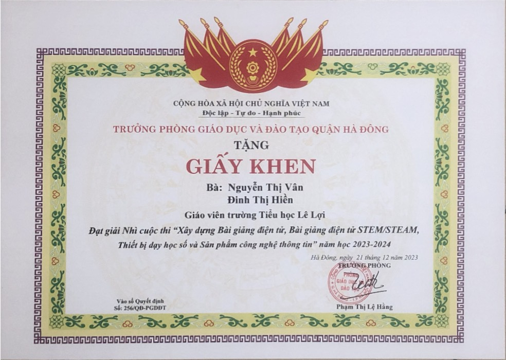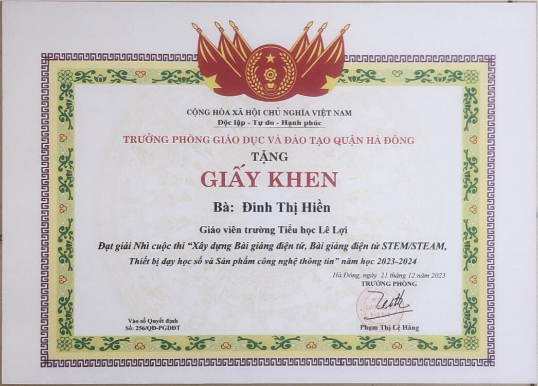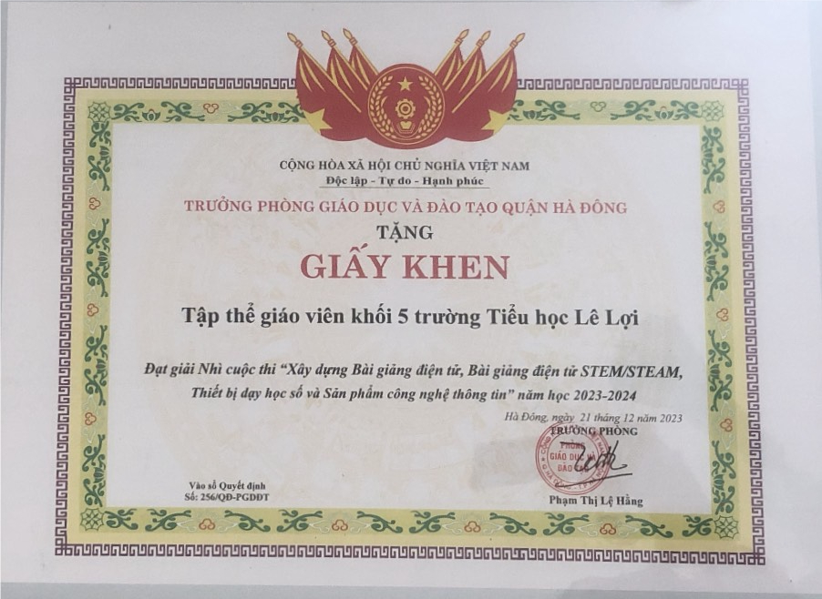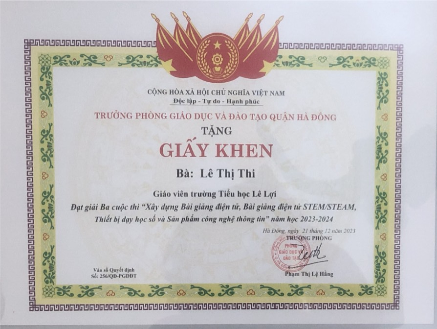 Thực hiện Kế hoạch số: 3433/KH-SGDĐT của Phòng GDĐT về việc tổ chức Cuộc thi “Xây dựng bài giảng điện tử, bài giảng điện tử Stem/Steam, thiết bị dạy học số và sản phẩm CNTT” quận Hà Đông năm học 2023 - 2024. Trường Tiểu học Lê Lợi đã phát động, tổ chức cuộc thi và đã lựa chọn ra 02 bài giảng Elearning, 01 sản phẩm CNTT, 01 sản phẩm thiết bị dạy học số tham gia cuộc thi cấp Quận.