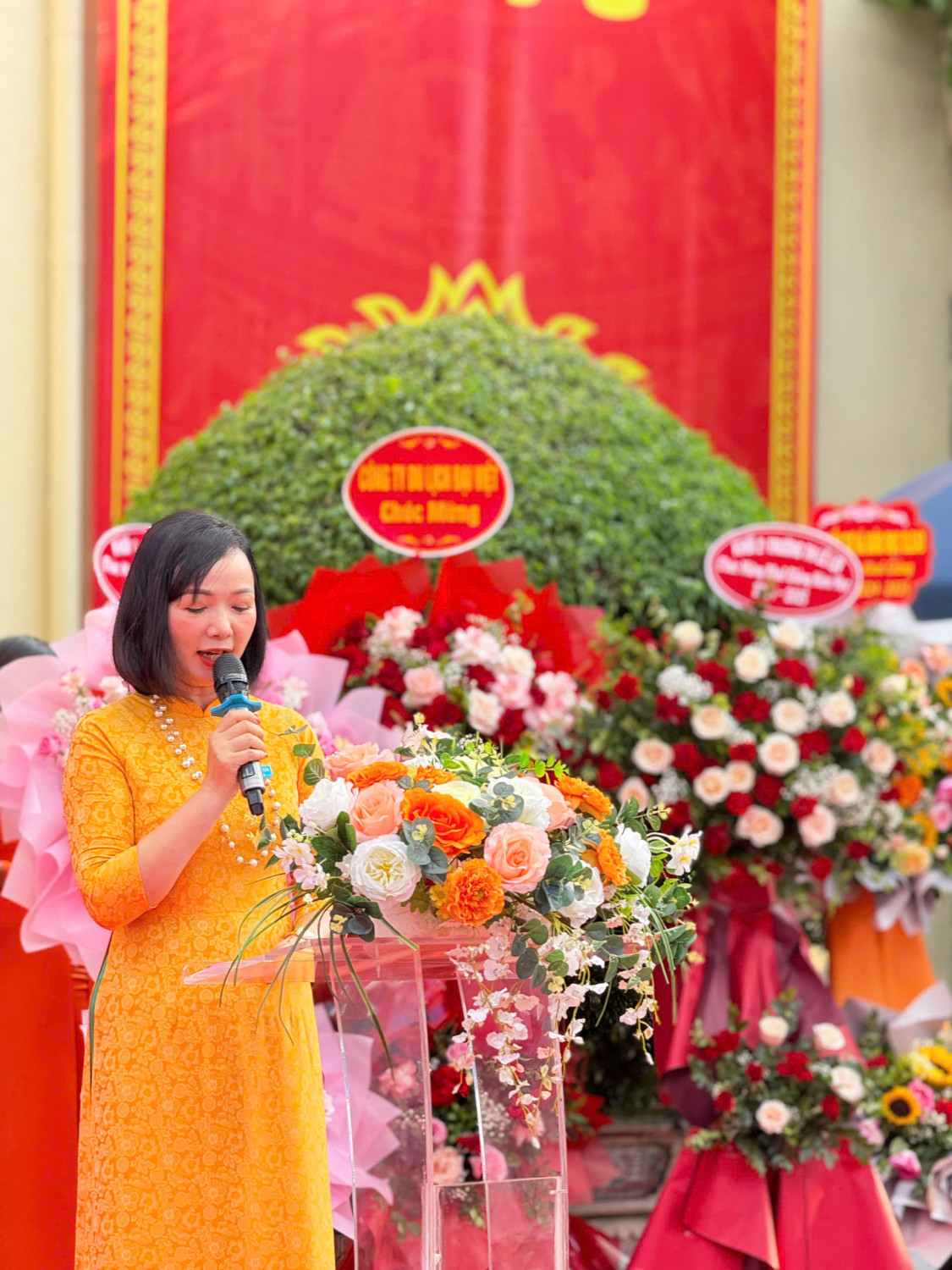 Bà Nguyễn Thu Hoài - Phó bí thư thường trực Đảng ủy Phường Hà Cầu tặng hoa chúc mừng nhà trường