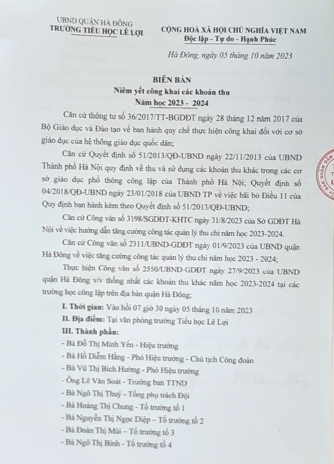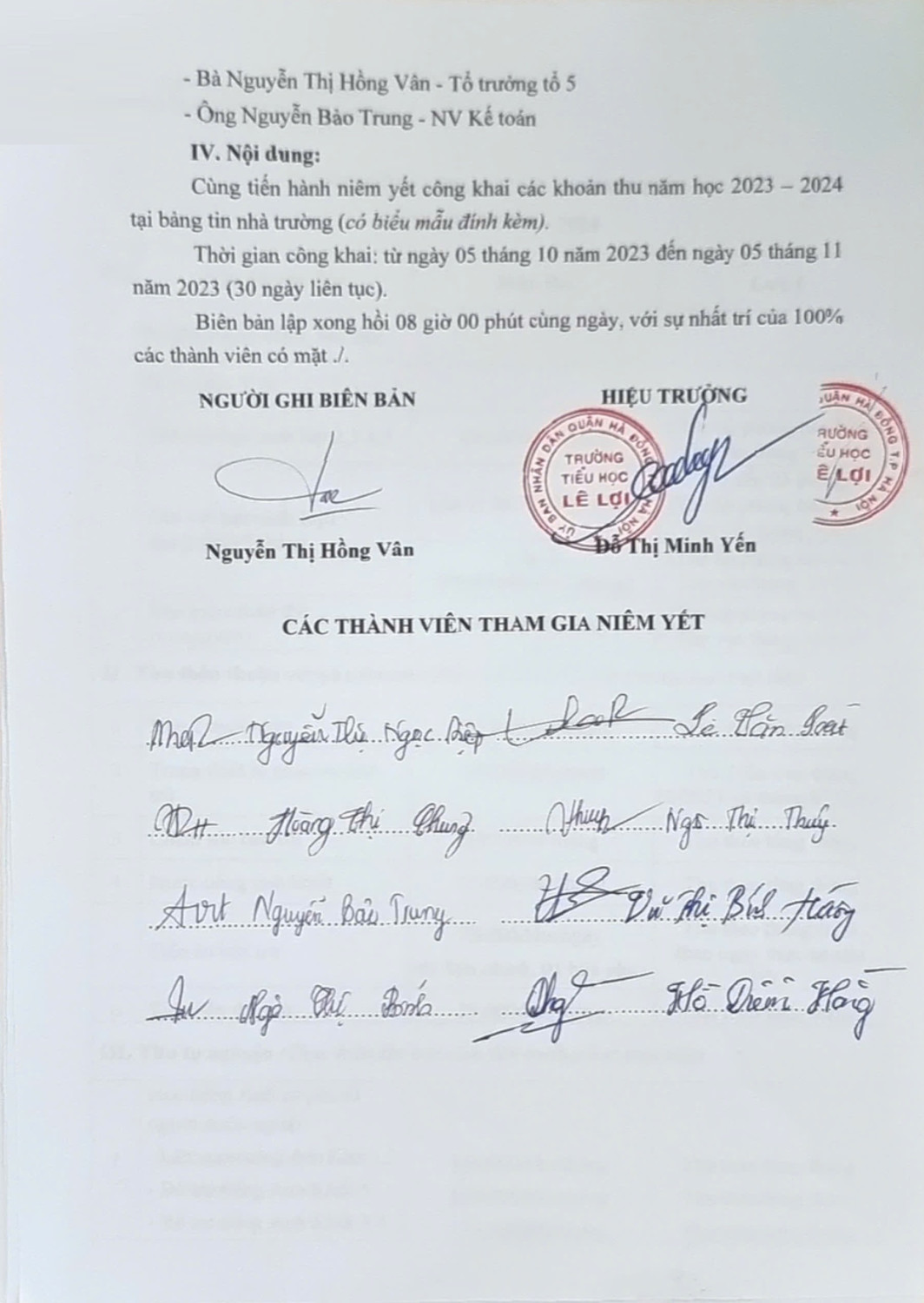 Biên bản Niêm yết công khai các khoản thu năm học 2023 - 2024