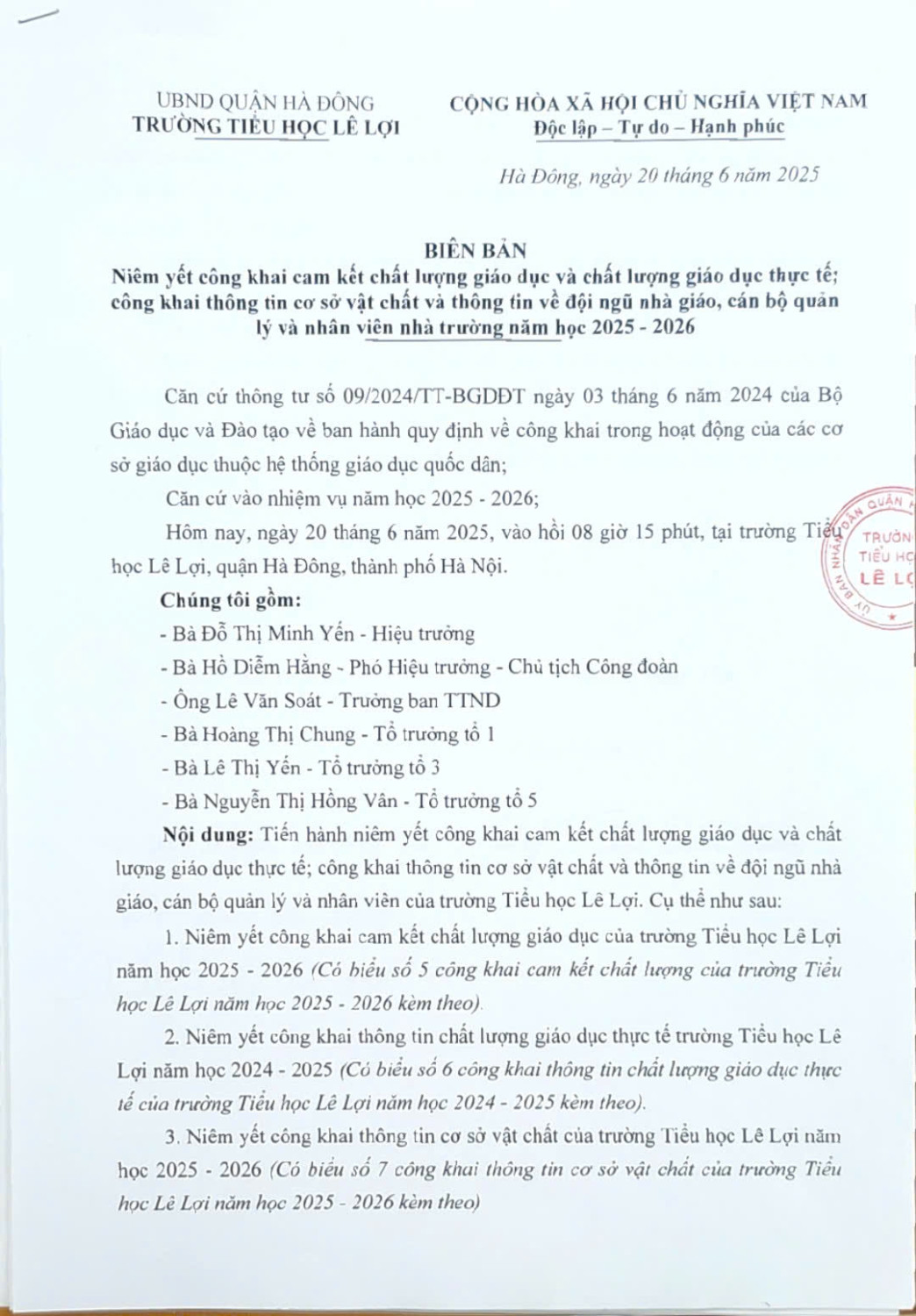 Biên bản niêm yết công khai cam kết chất lượng giáo dục và chất lượng giáo dục thực tế; công khai thông tin cơ sở vật chất và thông tin về đội ngũ nhà giáo, cán bộ quản lý và nhân viên nhà trường năm học 2025 - 2026