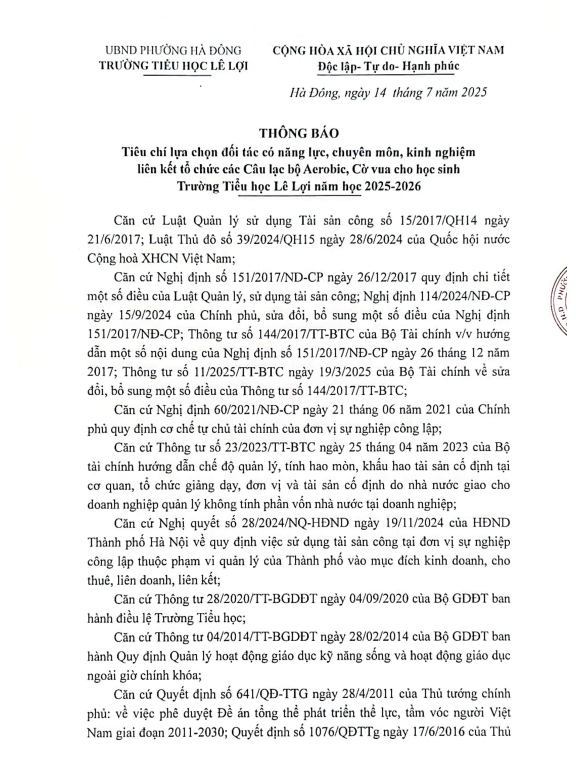 Thông báo tiêu chí lựa chọn đối tác có năng lực, chuyên môn, kinh nghiệm liên kết tổ chức các Câu lạc bộ Aerobic, Cờ vua cho học sinh Trường Tiểu học Lê Lợi năm học 2025-2026
