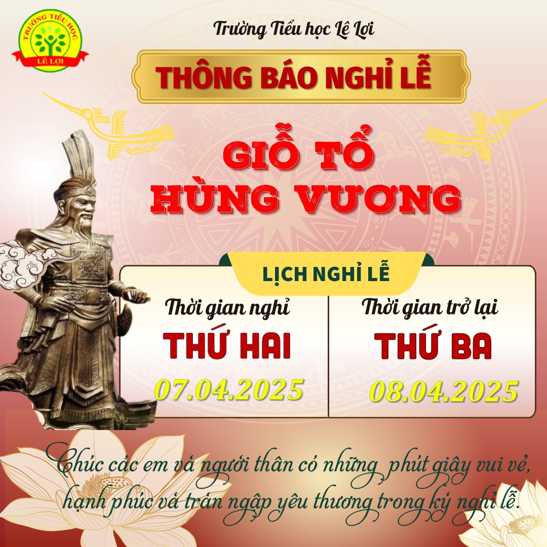 Trường Tiểu học Lê Lợi trân trọng thông báo tới quý PH và các em HS Lịch nghỉ Lễ Giỗ tổ Hùng Vương: