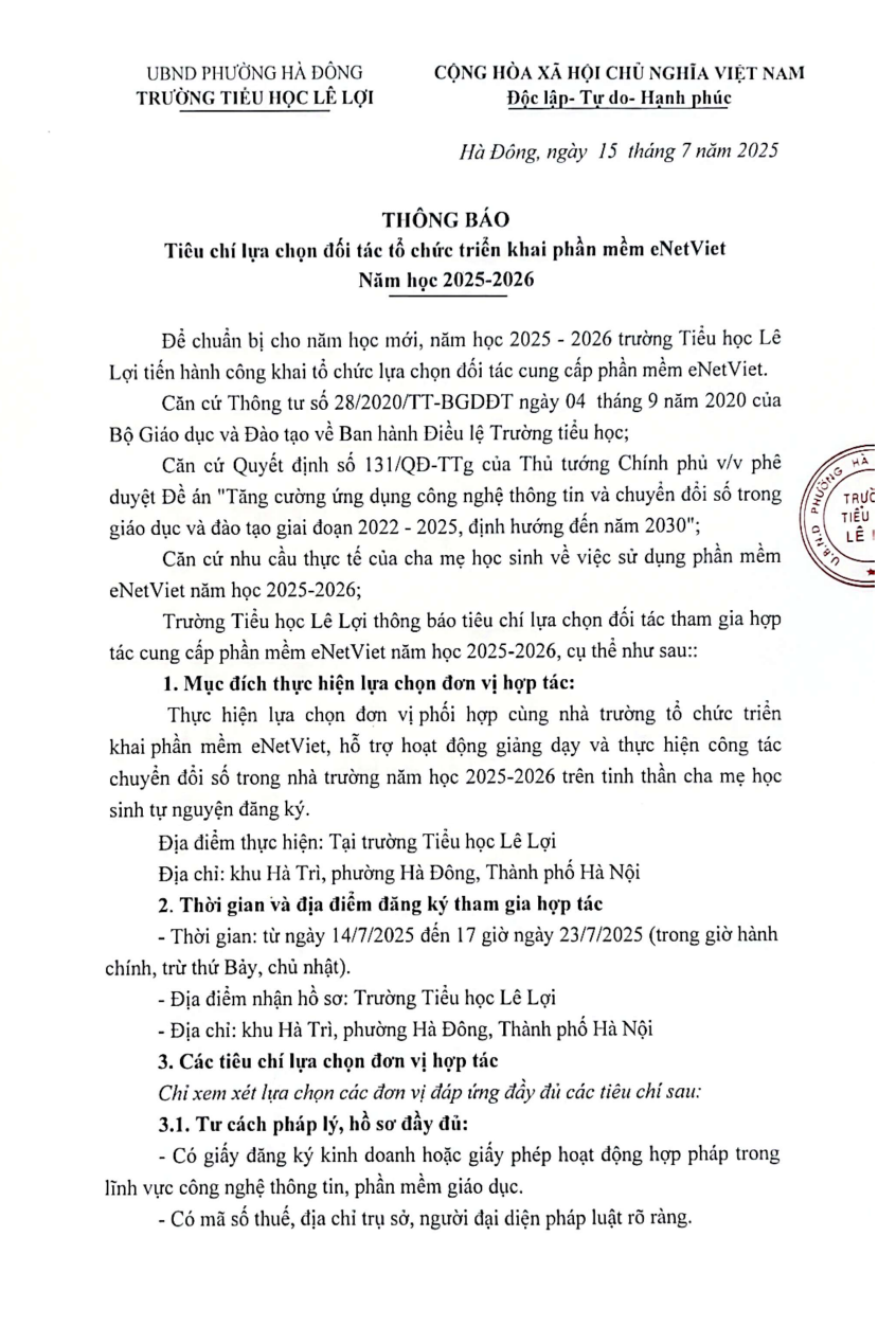 Thông báo tiêu chí lựa chọn đối tác tổ chức triển khai phần mềm eNetViet Năm học 2025-2026