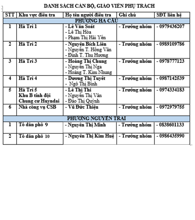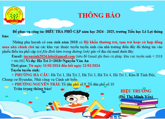 Rất mong CMHS hợp tác trong công tác điều tra để các thầy giáo, cô giáo hoàn thành nhiệm vụ và nhà trường có số liệu đăng ký tuyển sinh năm học 2024-2025. (Mọi thắc mắc và cần hỗ trợ CMHS có thể liên hệ với bộ phận hỗ trợ tuyển sinh của nhà trường, cô Ngô Thị Thùy Ninh (SĐT: 0377385326). CMHS có thể cập nhật thông tin và hướng dẫn thông qua cổng thông tin của nhà trường. + Website: https://c1leloi.pgdhadong.edu.vn/