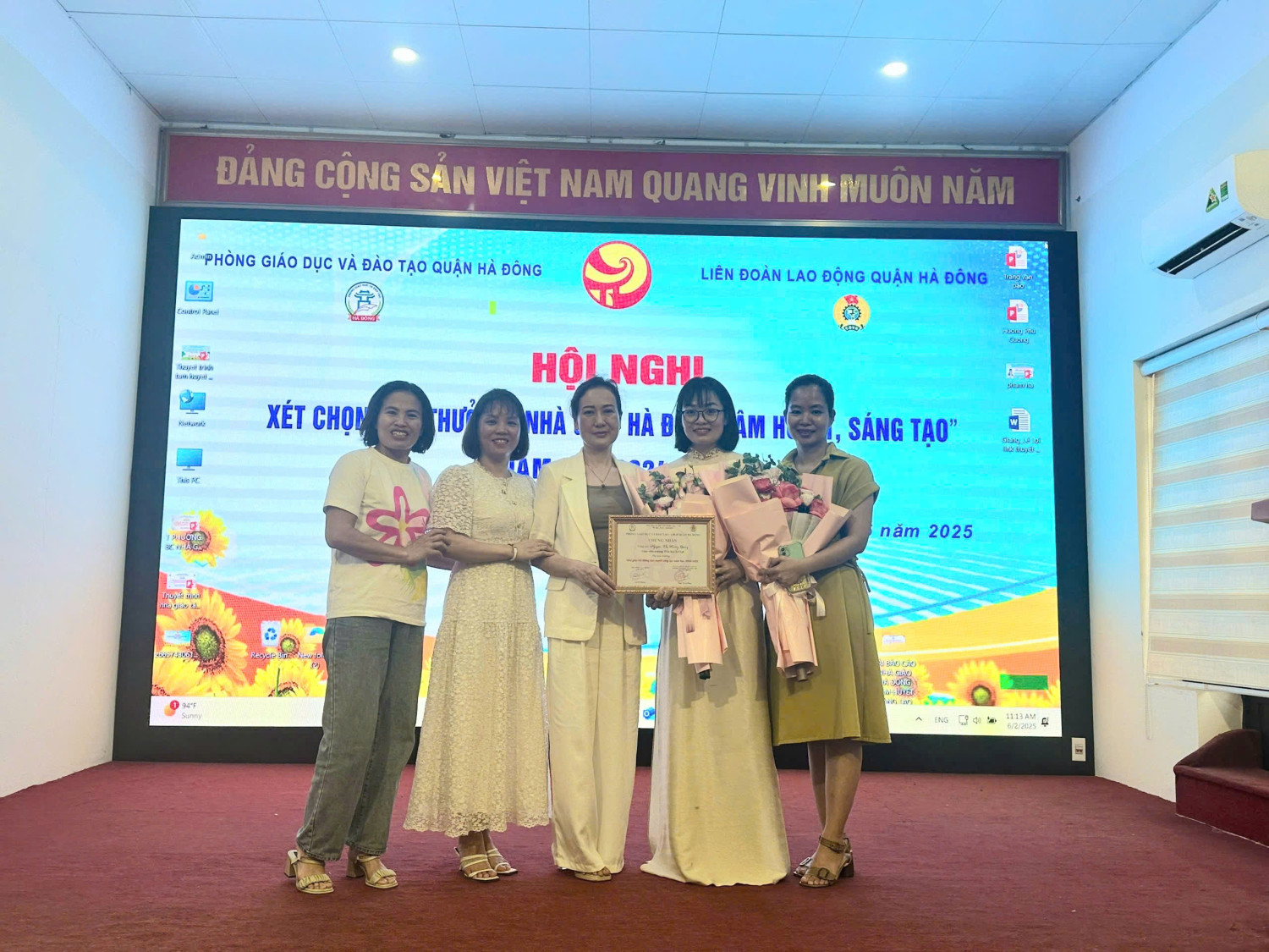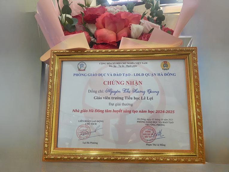 Ngày 02/6/2025, tại Hội trường Phòng Giáo dục và Đào tạo quận Hà Đông, cô Nguyễn Thị Hương Giang – giáo viên Tiếng Anh Trường Tiểu học Lê Lợi – đã xuất sắc đạt Giải Nhất trong Hội nghị xét chọn Giải thưởng “Nhà giáo Hà Đông tâm huyết, sáng tạo” năm học 2024–2025.