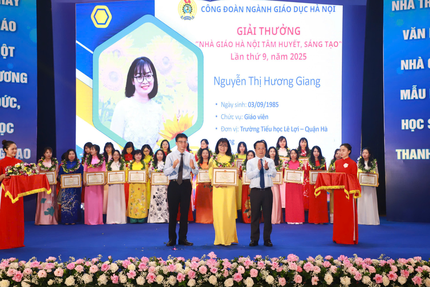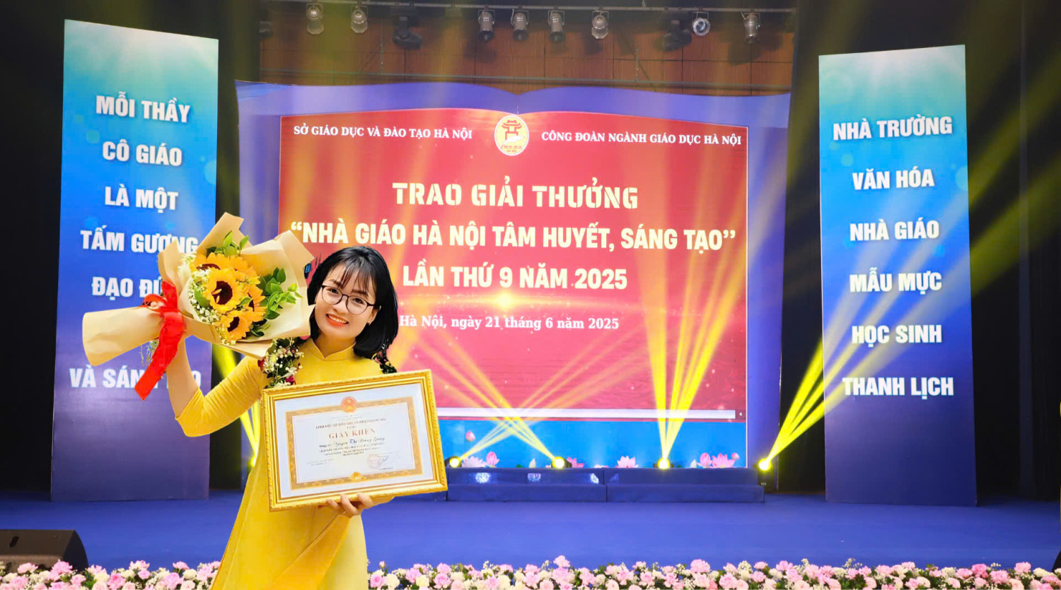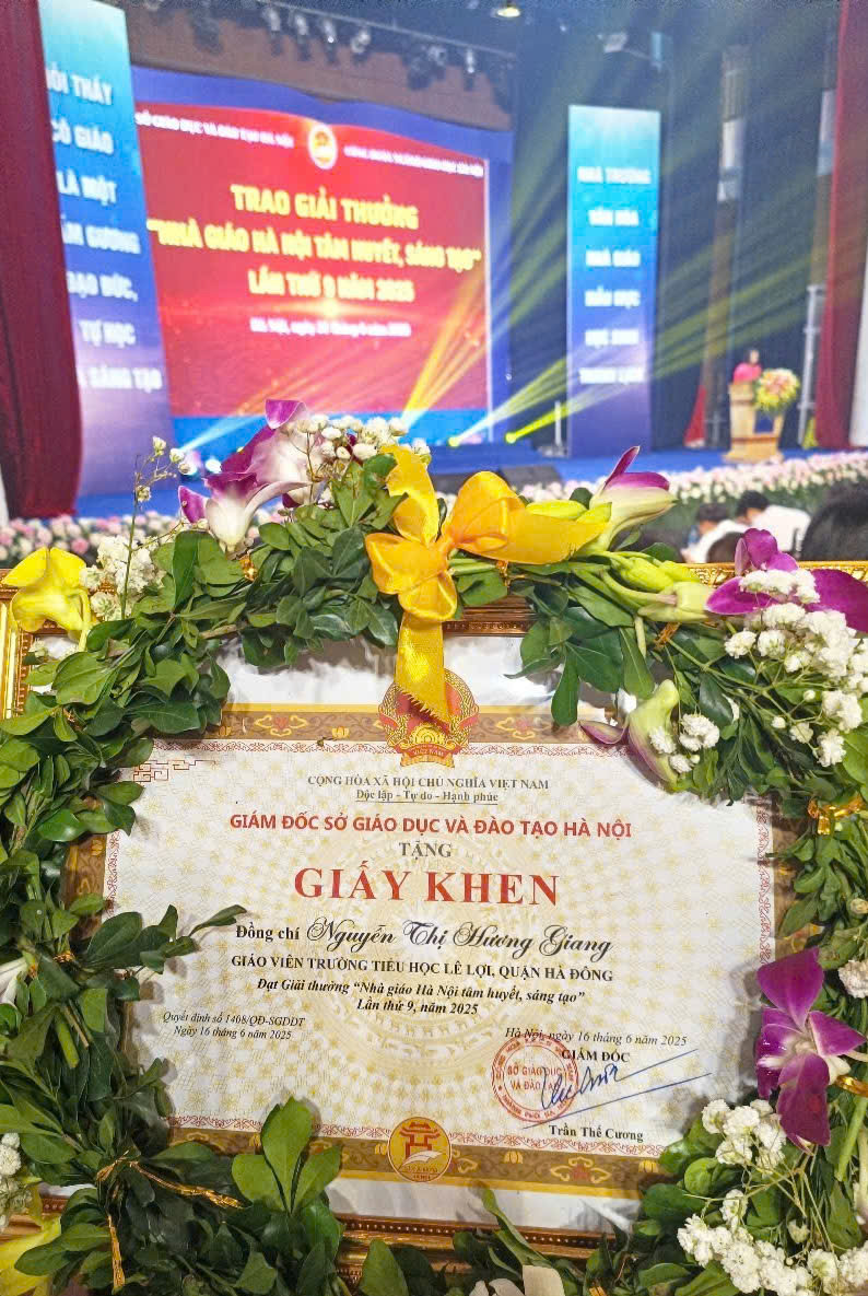☘ Ngày 21/6/2025, tại Hội nghị Tổng kết hoạt động công đoàn năm học 2024 – 2025 và trao Giải thưởng “Nhà giáo Hà Nội tâm huyết, sáng tạo” lần thứ 9 do Công đoàn ngành Giáo dục Hà Nội tổ chức, cô giáo Nguyễn Thị Hương Giang – giáo viên Tiếng Anh Trường Tiểu học Lê Lợi, Quận Hà Đông – đã vinh dự là 1 trong 80 nhà giáo xuất sắc toàn Thành phố được trao Giải thưởng “Nhà giáo Hà Nội tâm huyết, sáng tạo”.