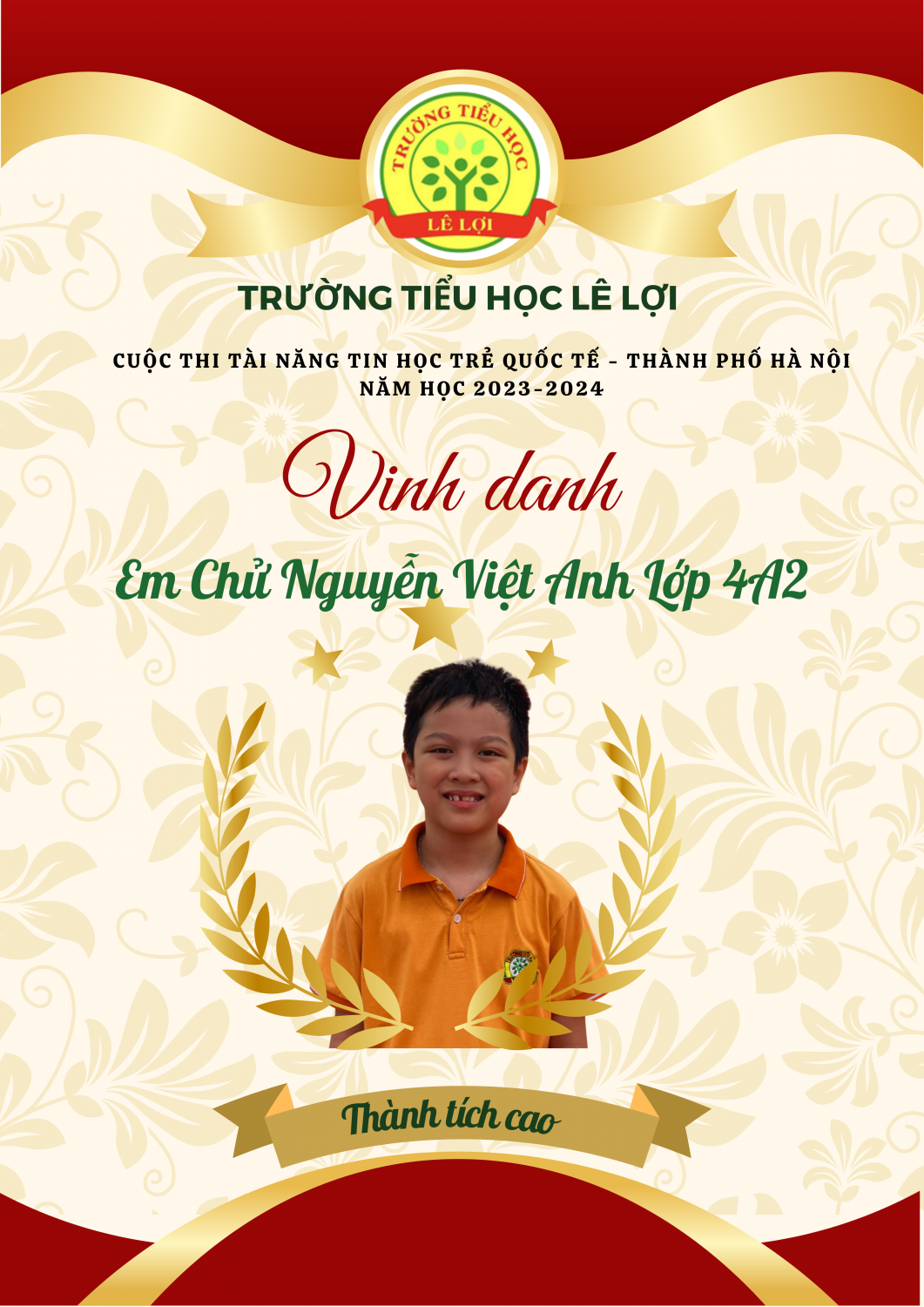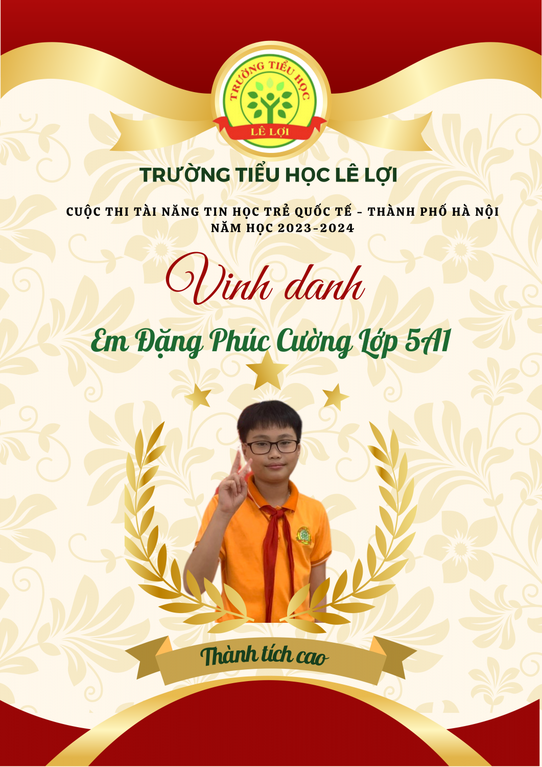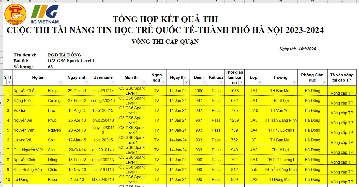 Tham dự cuộc thi Tài năng tin học trẻ quốc tế - Thành phố Hà Nội vòng thi cấp quận có các em HS đến từ các trường tiểu học trên địa bàn quận Hà Đông. Trường Tiểu học Lê Lợi đã chọn ra 3 HS có số điểm cao nhất từ vòng thi cấp trường tham dự. Sau khi hoàn thành bài thi, các em HS đều đạt số điểm rất cao. Thật vui mừng cho nhà trường vì đã có 2 trên 3 em HS có số điểm nằm trong Top 10 cấp quận và được dự thi cấp thành phố Hà Nội.