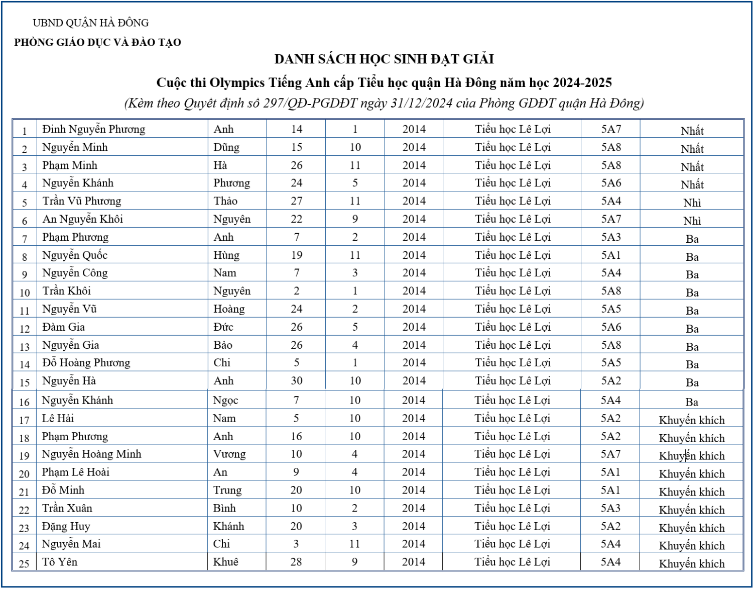 Trường Tiểu học Lê Lợi tự hào vinh danh những học sinh xuất sắc đã đạt thành tích cao trong Kỳ thi Olympic Tiếng Anh cấp Tiểu học Quận Hà Đông năm học 2024-2025. Đây không chỉ là niềm tự hào của nhà trường mà còn là minh chứng cho sự cố gắng, tinh thần học tập và quyết tâm của các em học sinh.
